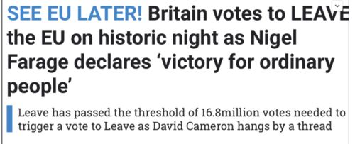 'See EU later'イギリスの国民投票の結果、EU離脱の民意が示されました。これから2年かけて、様々な手続きが経て、イギリスはEUから離脱します。 記事では“See EU later”という見出しになっており、see you laterとうまくかけられています。大衆紙 The Sun…